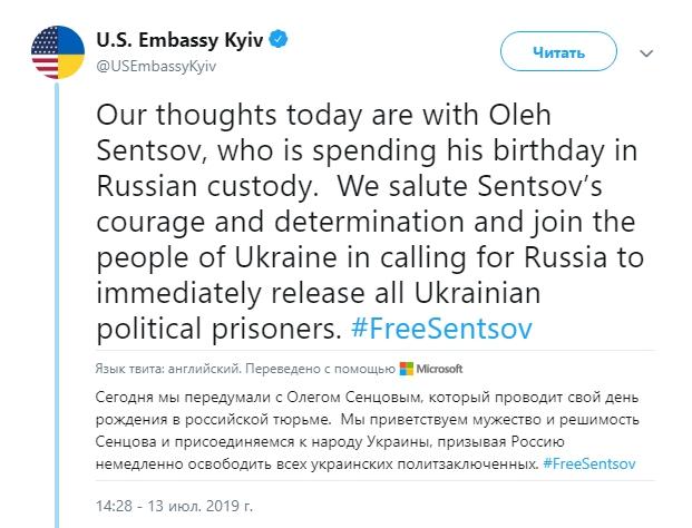Посольство США в Украине призвало Россию освободить Олега Сенцова и всех украинских политзаключенных.