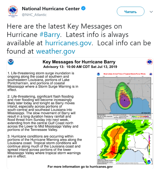 "Барри" набрал силу урагана, двигаясь к побережью Луизианы", – говорится в сообщении.