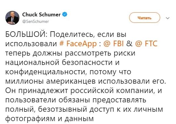 Со слов лидера американских демократов, приложение принадлежит российской компании, и пользователи перед его использование обязаны предоставлять полный безотзывный доступ к их личным фотографиям и данным.