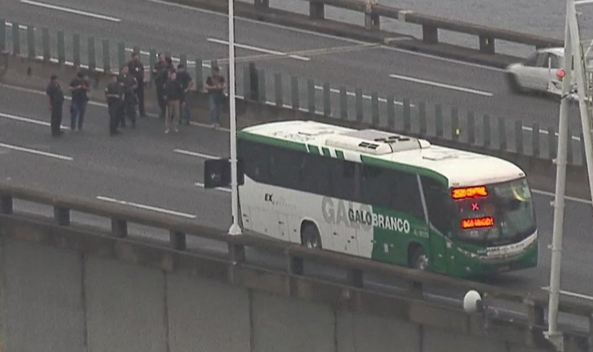 Преступник остановил автобус на мосту через залив Гуанабара и начал угрожать облить его бензином и сжечь. Полиция ведет переговоры с террористом, на данный момент удалось освободить 6 заложников.