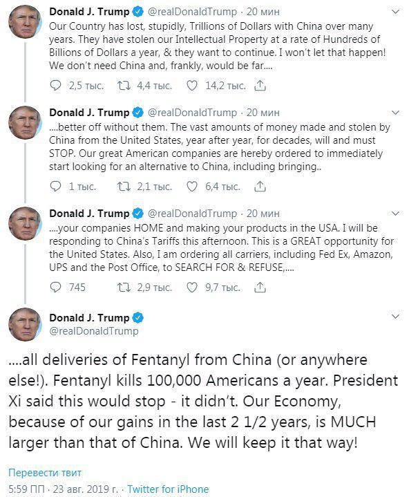 "Наша страна глупо теряла триллионы долларов из-за Китая многие годы. Они крали нашу интеллектуальную собственность стоимостью миллиарды долларов каждый год, и они хотят продолжать делать это. Я не позволю этому случиться. Нам не нужен Китай. Откровенно говоря, нам было бы намного лучше без них. Китай зарабатывал на Штатах и крал у нас год за годом, и этому необходимо положить конец...", - написал Трамп.