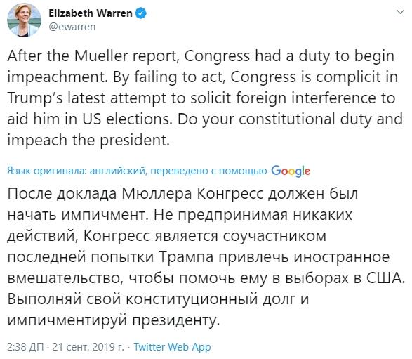 А участница президентской гонки конгрессвумен Элизабет Уоррен призвала к началу импичмента президента.