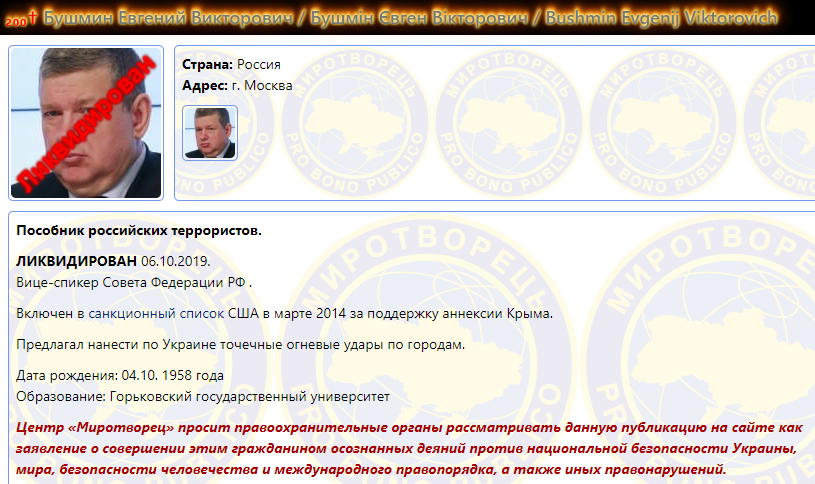 С 2014 года Бушмин находился под санкциями США из-за аннексии Крыма. Его анкета есть в "чистилище" украинского сайта "Миротворец", куда вносятся данные обо всех российских террористах и их пособниках.