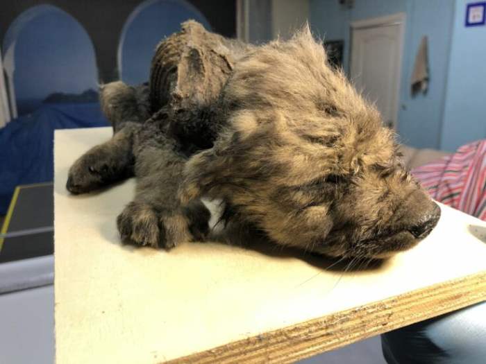 Используя датирование углерода на ребре существа, эксперты из Шведского центра палеогенетики смогли подтвердить, что образец был заморожен около 18 000 лет, но обширные тесты ДНК до сих пор не смогли показать, было ли животное собакой или волком.