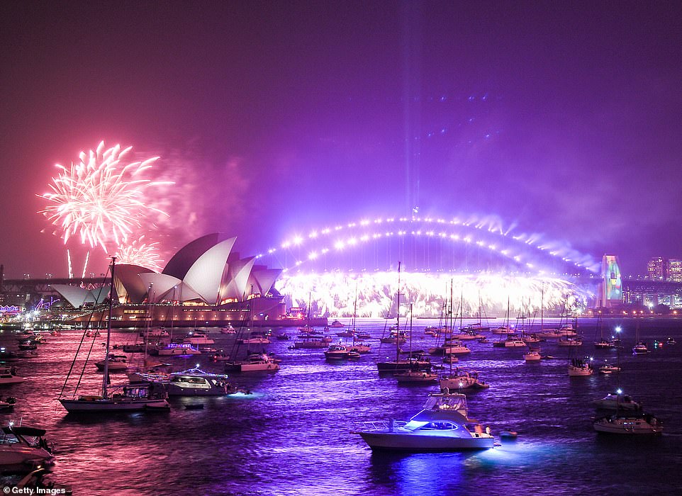 Чтобы посмотреть на фейерверк, тысячи людей еще днем собираются на берегах Сиднейской гавани и ждут много часов на жаре (в Австралии Новый год наступает в разгар лета). Фейерверки запустили 31 декабря в 21:00.