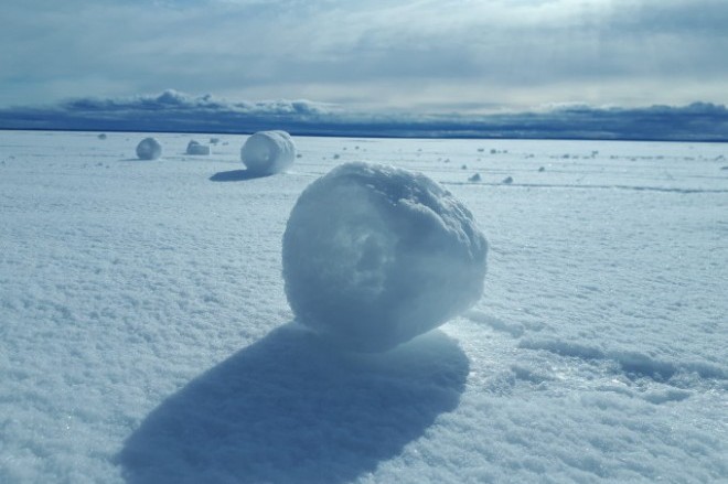 "Тюки" из снега создает ветер при температуре, близкой к точке замерзания. Скорость ветра должна быть не менее 48 км в час, а температура +3 +5 градусов Цельсия. Необходимо также легкое пыление влажной снежной пыли над слегка примерзшим слоем у самой поверхности земли.