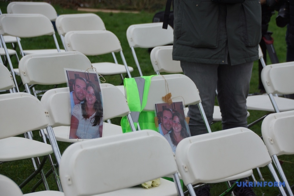 На стульях разложили белые розы и установили портреты жертв. Также были вывешены плакаты с требованиями установить правосудие.