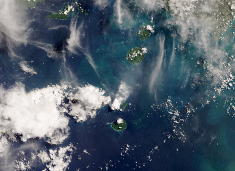 На спутниковом снимке можно разглядеть клубы пепла и пара, а также стекающий в океан поток раскаленной лавы.