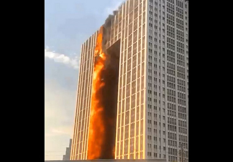 В китайском городе Далянь начался мощный пожар в небоскребе Kaixuan International Building. Пламя охватило большую часть дома.