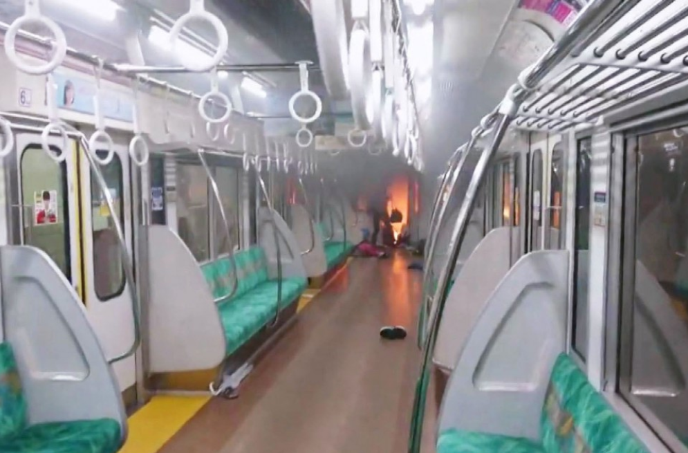 В Токио мужчина напал с ножом на пассажиров поезда метро и устроил пожар, пострадало не менее 10 человек.