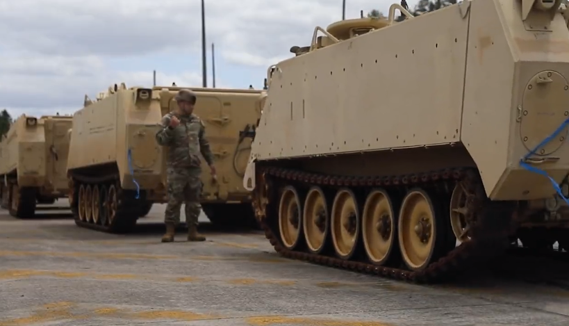 .@USArmy soldiers move M113 Armored Personnel Carriers bound for Ukraine onto truck trailers at @USAGStewartHAAF, Georgia. pic.twitter.com/P2cvS9bbE3