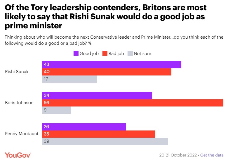 Как показал опрос, Сунак - единственный кандидат, который не будет плохим премьером. Британцы считают, что у него больше шансов возглавить правительство, чем у Джонсона или Мордонт.