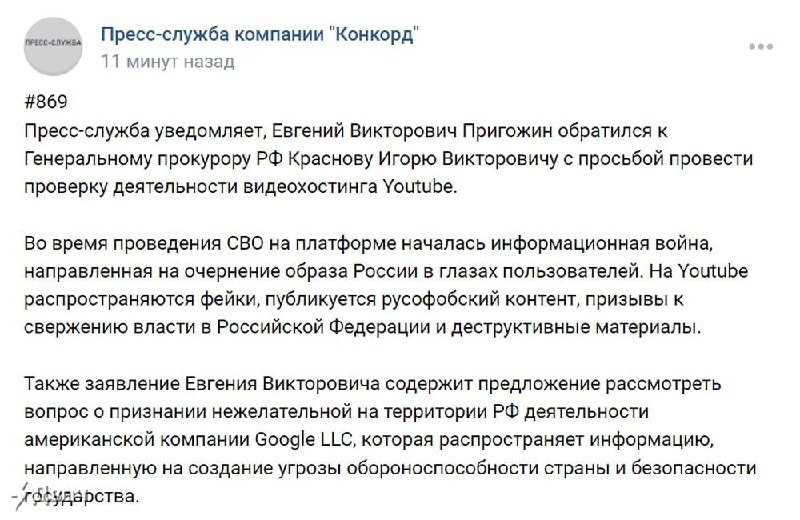 Пригожин возмущен, что на Youtube якобы "распространяются фейки, публикуется русофобский контент, призывы к свержению власти в Российской Федерации и деструктивные материалы". Заменить YouTube он предлагает VK, Rutube, "Одноклассники", "Дзен".