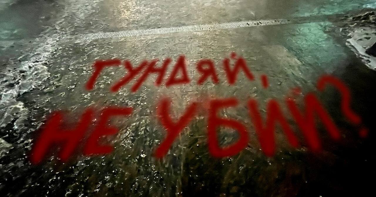 У храма Христа Спасителя появилась красная надпись "Гундяй, не убий?", адресованная патриарху Кириллу, который активно поддерживает войну против Украины.
