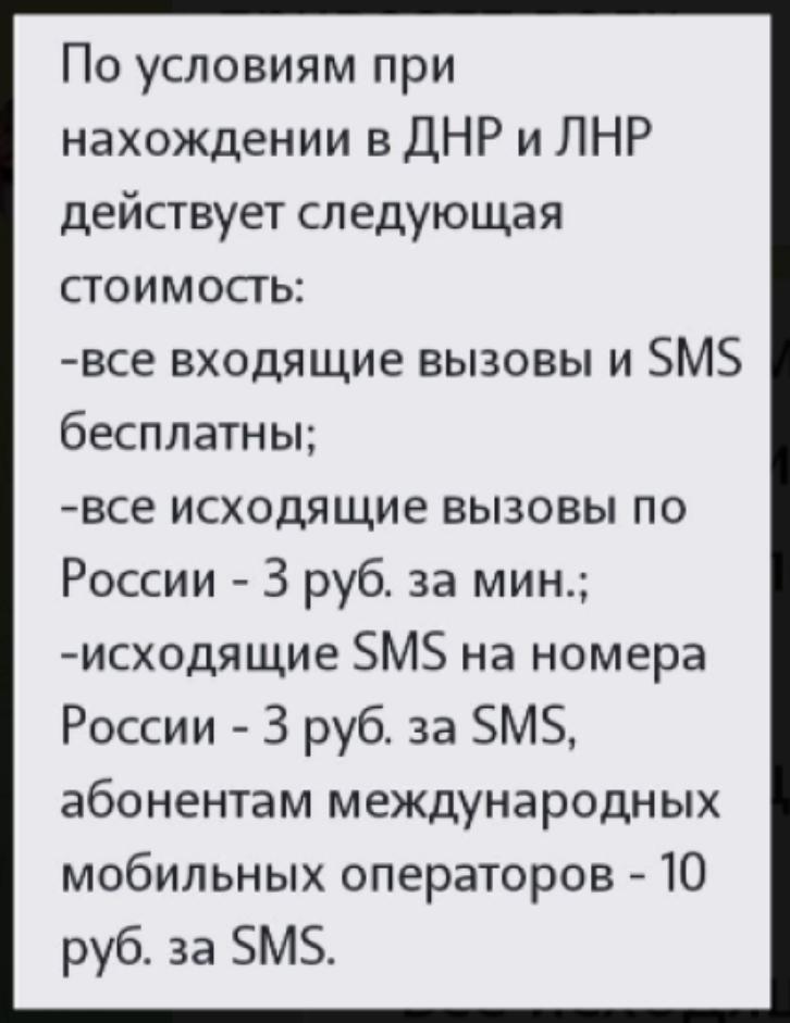 "По условиям при нахождении в ДНР и ЛНР действует следующая стоимость: