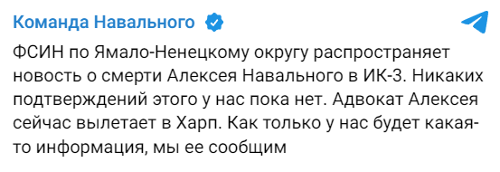 "Шестнадцатого февраля 2024 года в исправительной колонии №3 осужденный Навальный А.А. после прогулки почувствовал себя плохо, практически сразу потеряв сознание. Немедленно прибыли медицинские работники учреждения, была вызвана бригада скорой медицинской помощи. Реанимационные меры положительных результатов не дали. Врачи быстро констатировали смерть осужденного. Причины смерти устанавливаются", - говорится в сообщении.