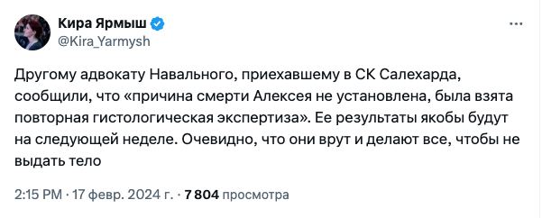 "Адвокат и мать Алексея приехали в салехардский морг. Он закрыт, несмотря на уверения колонии, будто он работает и тело Навального находится там. Адвокат позвонил по указанному на двери телефону. Ему сказали, что он уже седьмой, кто сегодня звонит. Тела Алексея у них в морге нет", - сообщила она.