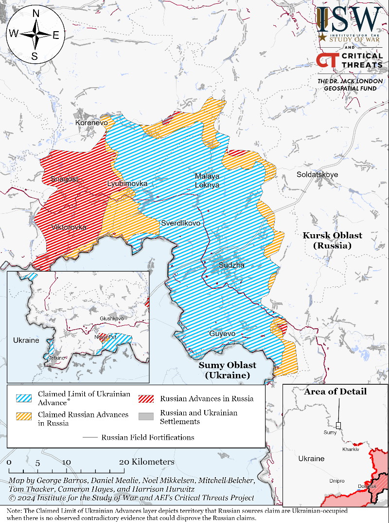 По данным ISW, оппозиционное издание "Новая газета Европы" выявило, что спецназ ФСБ, в частности группы "Альфа" и "Вымпел", принимает участие в боях в Курской области. В августе 2024 года в столкновениях погиб один из военнослужащих спецназа, что подтверждает активное участие ФСБ в боевых действиях.