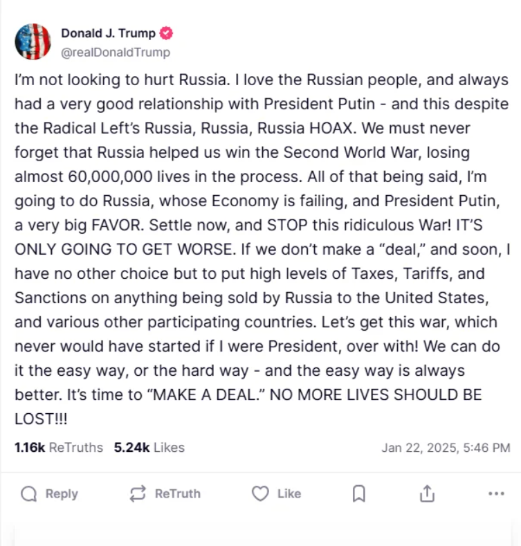 "Я люблю русский народ и всегда имел очень хорошие отношения с Путиным. Россия помогла нам победить во Второй мировой войне, потеряв почти 60 миллионов жизней", - написал Трамп.