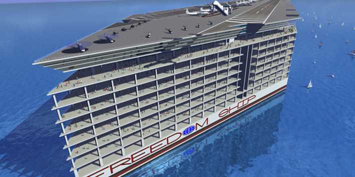 Компания Freedom Ship International Inc. собирается построить самое большое в мире плавающее судно, которое будет представлять собой полноценную городскую единицу со своими школами, парками, медучреждениями, спортзалами, магазинами, развлекательными центрами и прочей инфраструктурой, необходимой любому городу. Офисы, банки, библиотека, театры, бассейны, казино – здесь будет все для работы и отдыха.