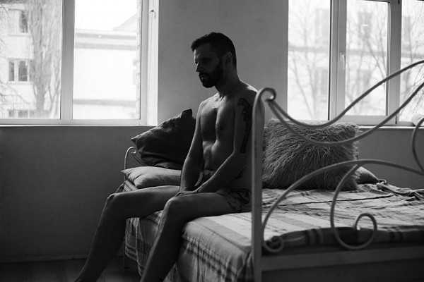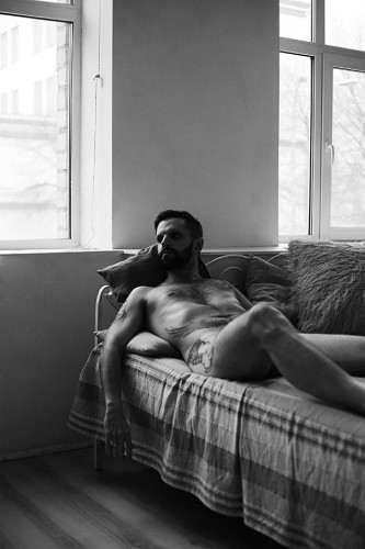 В новой фотосессии Алексей предстал перед публикой совершено обнаженным. Черно-белые снимки сделаны в квартире с лаконичным интерьером. Гладушевский позирует у кирпичной стены и лежа на софе.