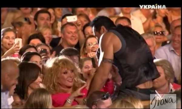 Костюшкин выбежал в зал, запрыгнул на стол перед Примадонной и стал ритмично двигаться. В какой-то момент певец потерял равновесие и упал прямо на Аллу Борисовну.