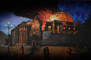 Полотно неизвестного автора под названием "Последний день Рады" продали на аукционе за 121 тыс. грн. На ней изображена Верховная Рада в огне и люди, наблюдающие за пожаром. Полученные деньги пойдут на нужды АТО, рассказывает Юлия Никитина, которая занималась содержанием картины. Торги проходили на интернет-портале издания "Левый берег", пишет gazeta.ua .