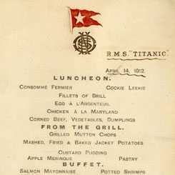 На этом меню стоит дата - 12 апреля, в нем перечислены блюда, которые предлагались пассажирам в тот день - бараньи отбивные, английские пироги с рубленой свининой, пудинг с тапиокой - крахмальной кашицей из корней тропического растения. Отмечается, что это меню находилось в кармане пальто француженки Элизы Люретт, в котором она покинула лайнер.