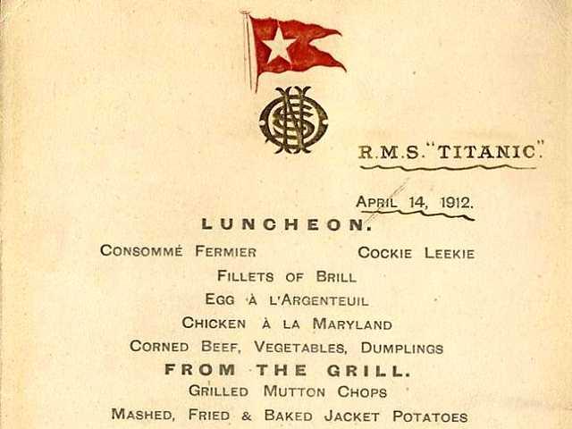 Меню ресторана для пассажиров первого класса с «Титаника» продано на торгах британского аукционного дома Henry Aldridge & Son за 96,5 тысячи долларов, сообщают BBC News. Оно датировано 12 апреля 1912 года, и в нем перечисляются блюда, которые подавали в тот день состоятельным пассажирам затонувшего лайнера: английские пироги с рубленой свининой, бараньи отбивные, пудинг с тапиокой.