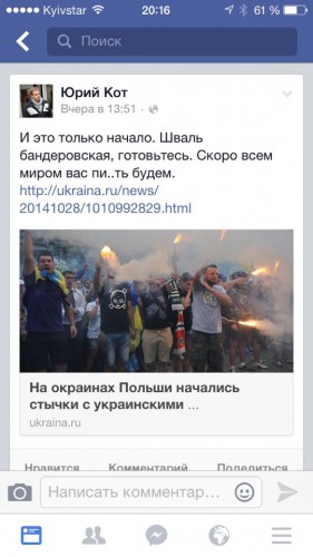 "Упир ти, Юра Кот!!! Краще тобі, покидьок, не траплятись у мене на шляху! Щодо лайків, які я бачу на фото... "это понравилось" Владимиру Пригладю, для того, щоб ви шановні знали, що це чоловік Наталки Валевської".