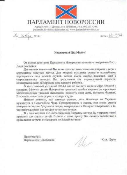 Царев от имени "депутатов парламента "Новороссии" поздравил Деда Мороза с Днем рождения (сегодня, 18 ноября в России празднуют день рождения мифологического существа), о чем сообщил на своей странице в Фейсбуке, пишет Еспресо.TV.