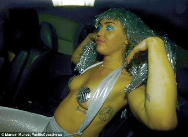 Майли пришла на мероприятие топлес. Артистка прицепила к ореолам серебристые декоративные кружки, а на ноги надела лосины с блестками. Больше на девушке ничего не было надето. Завершил образ певицы яркий макияж и серебристый парик из “дождика“.