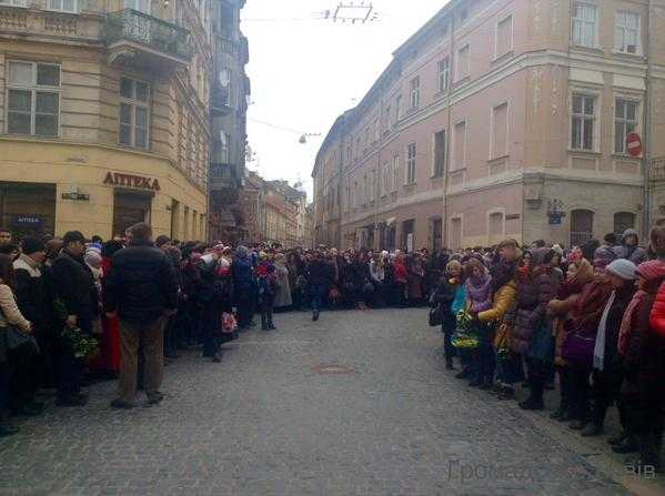 Сегодня, 4 февраля, во львовском храме состоится прощание с артистом Андреем Кузьменко. Прощание начнется в 16 часов. Но уже сейчас на пути к в Преображенской церкви люди создали живой коридор. Люди выстроились по обеим сторонам улицы на расстояние более ста метров.