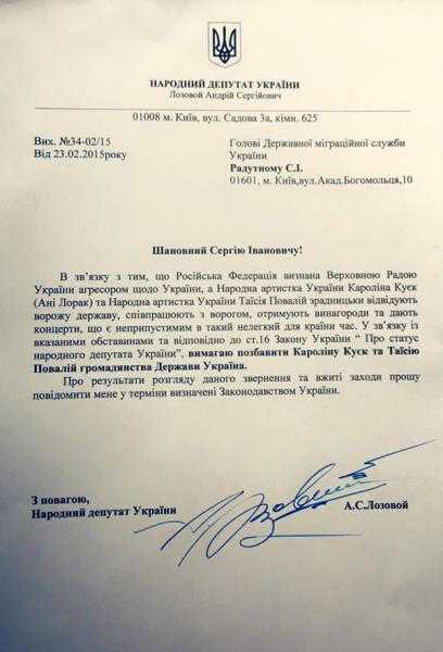 Народный депутат Украины Андрей Лозовой обратился к главе Государственной миграционной службы Сергею Радутному с требованием лишить украинского гражданства Ани Лорак и Таисию Повалий. Фото обращения Лозовой выложил на своей странице в Facebook, передает depo.ua.
