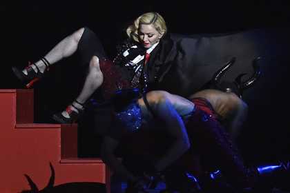 56-летняя Мадонна, на которой была надета длинная мантия, стояла на ступенях, которые вели к расположенному выше подиуму. Вероятнее всего, по замыслу танцор должен был эффектно сдернуть мантию с певицы, однако вместо этого потянул вниз саму Мадонну, которая в результате упала на сцену, пролетев три ступени.