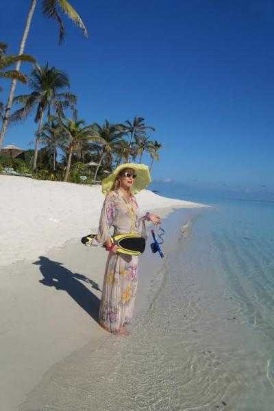 Ей здесь не скучно: она занимается йогой, сидит на диете из папайи, ходит на массажи в СПА пятизвездочного отеля Loama Resort Maldives, катается на каное, водит гидросамолет, рассекает по Индийскому океану на яхте и даже ловит рыбу. Но нам тоже нескучно наблюдать за ней. Особенно тогда, когда она занимается сноркелингом в вечернем шелковом платье, в дизайнерской шляпе, в массивных украшениях и в ластах.