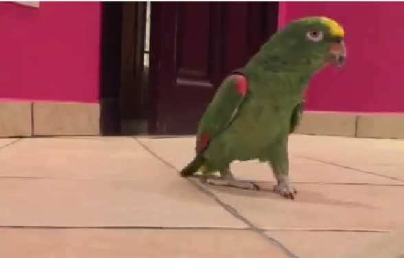 На видео попугай выходит из-за приоткрывшейся двери озираясь в разные стороны. Затем птица начинает громко и заразительно хохотать, копируя смех своего хозяина.
