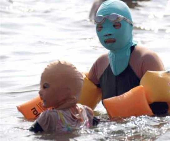 В данном направлении моды в нынешнем году «отличились» китайцы, которые изобрели новый пляжный аксессуар – купальник для лица или как его еще называют «фейскини». Это нейлоновая маска, которая скрывает практически все лицо, оставляя лишь маленькие прорези для глаз, ноздрей и рта. Предназначение ее – защита от воздействия солнечных лучей.
