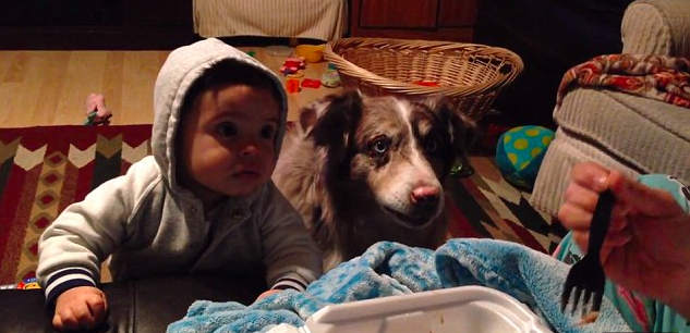 На 30-секундном видео мать кормит девятимесячного мальчика и хочет, чтобы он сказал "мама". Пес оказался сообразительным и ради вкусненького сымитировал слово.
