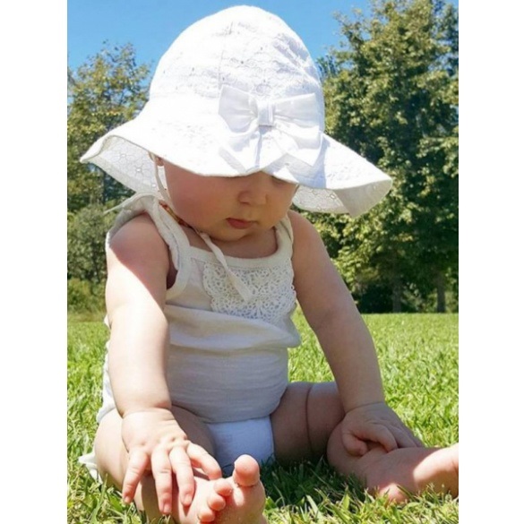 На фотографии дочь прославленного украинского боксера и американской актрисы сидит на траве и рассматривает свою ножку. Половина лица девочки скрыта под белой панамкой с бантом.