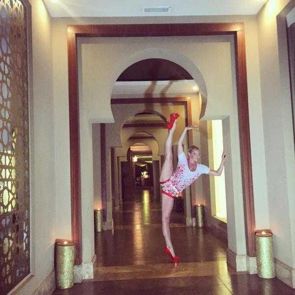 В этот раз балерина демонстрирует очередной шпагат в откровенном боди и красных туфлях на высоких каблуках.