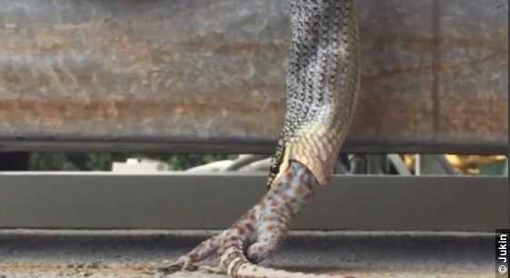 По рассказам очевидца, рептилия справилась с ящерицей почти за два часа. Сначала геккон всячески оказывал сопротивление своей противнице, вонзая в нее свои зубы. Однако потом змея обвила жертву, чем сделала ее беспомощной, и полностью проглотила.