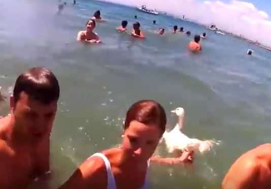 Та недолго думая схватила плававшую рядом утку за лапы и начала хлестать ей мужчину.
