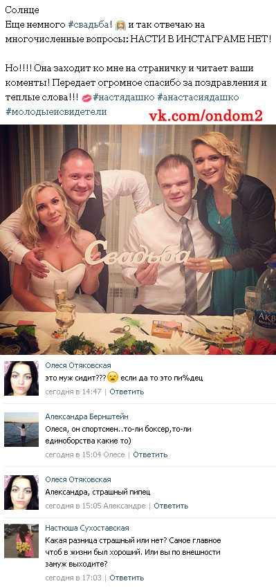 Именно Ольга первой опубликовала фотографии новоиспеченных супругов. Увидев избранника Дашко, поклонники звездного дома сравнили его с бывшей любовью Насти Сэмом Селезневым, за которого Дашко также мечтала выйти замуж.