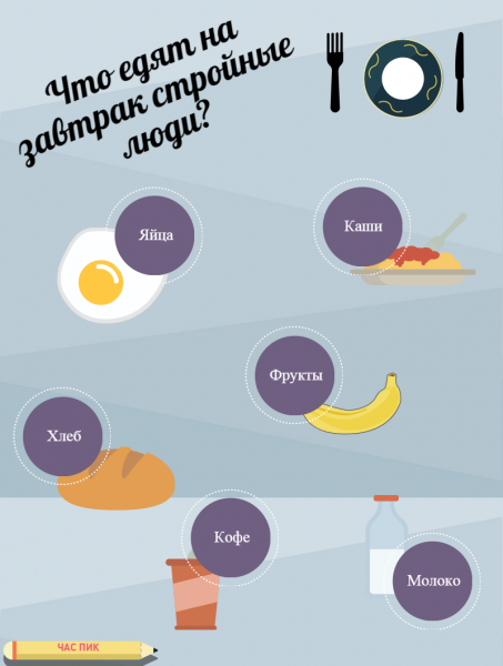 На завтрак стройные люди чаще всего едят фрукты — с утра их употребляет 51 % опрошенных. На втором месте — молочные продукты, ими завтракает 41 % респондентов. На третьем — мюсли (33 %).