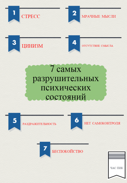 Такие объемы информации в одиночку просто нереально обработать. Но группа ученых из Duke University Medical Center, что в Северной Каролине, США, во главе со Стивеном Бойлом попытались это сделать. Результаты их работы, конечно, коллег не удивили, а для большинства простых людей стали просто открытием. Как оказалось, из 7-ми пунктов списка самым известным «разрушителем» оказался стресс, а вот о вреде остальных 6-ти проявлений мало кто задумывается.