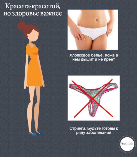 Кроме того, форма стрингов также усугубляет многие заболевания, так как узенькая тесемка между ягодицами в буквальном смысле помогает кишечным бактериям спускаться из ануса во влагалище.