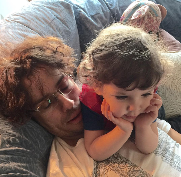 На первом фото запечатлены ее супруг Максим Галкин и двухлетний сын Гарри. На фото малыш разместился на спящем отце.