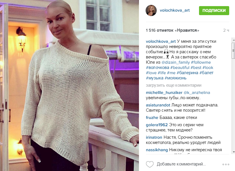Также Анастасия поблагодарила свою знакомую за чудесный свитер, в котором и позирует на фото. Но поклонники почему-то не оценили ни снимок, ни пост. Многие уверены, что Волочкова опять пытается привлечь к себе внимание, хотя на самом деле ничего интересного в ее жизни не происходит. Также подписчики раскритиковали наряд звезды и ее внешний вид в целом.