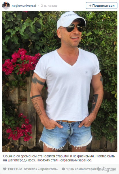 Снимок Нагиев сопроводил забавной подписью: «Обычно со временем становятся старыми и некрасивыми. Люблю быть на шаг впереди всех. Поэтому стал некрасивым заранее, – иронично подписал телеведущий».